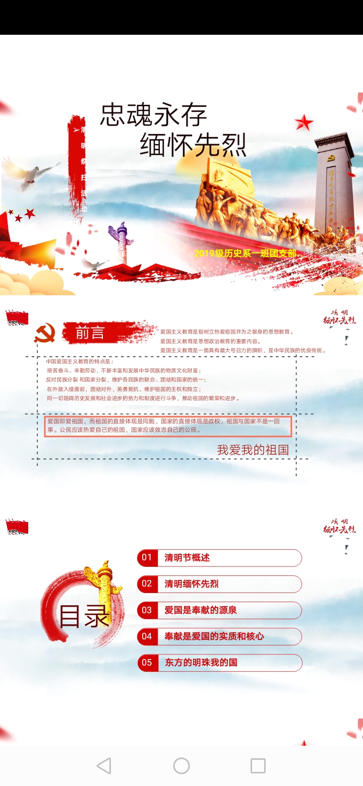 历史学2019级1班学生以PPT形式学习了《忠魂永存,缅怀先烈》,其主要内容包括清明节概述、清明缅怀先烈、爱国是奉献的源泉、奉献是爱国的实质和核心、东方的明珠我的国等5个部分。同学们发表自己的看法和观点,纷纷向革命战争年代,和平建设时期的先烈和当今战疫中的逆行英雄致敬与感谢。