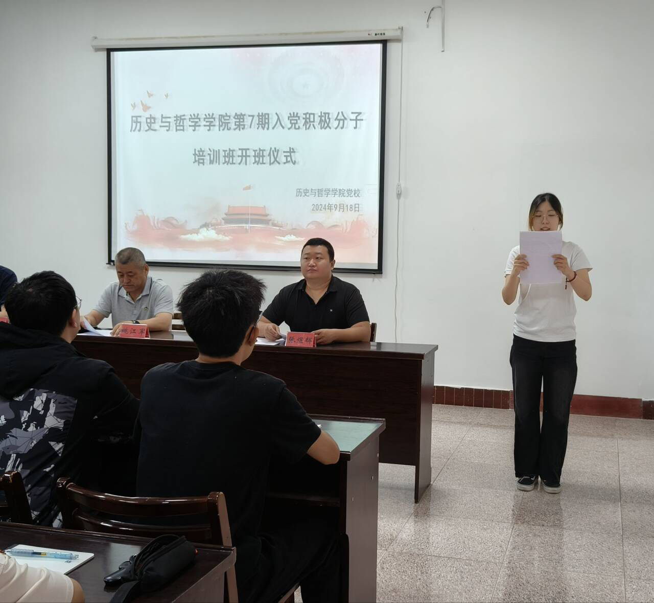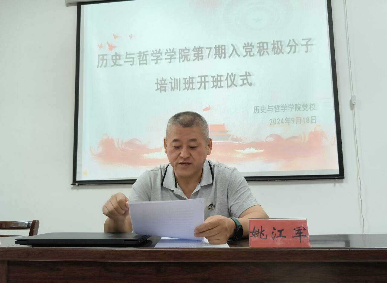 在史哲院204会议室举行了第七期入党积极分子培训班开班仪式。学院党委书记姚江军同志,学院党政办公主任张煜辉同志,历史系主任、教师党支部书记孙长龙同志以及30名入党积极分子参加了此次仪式。