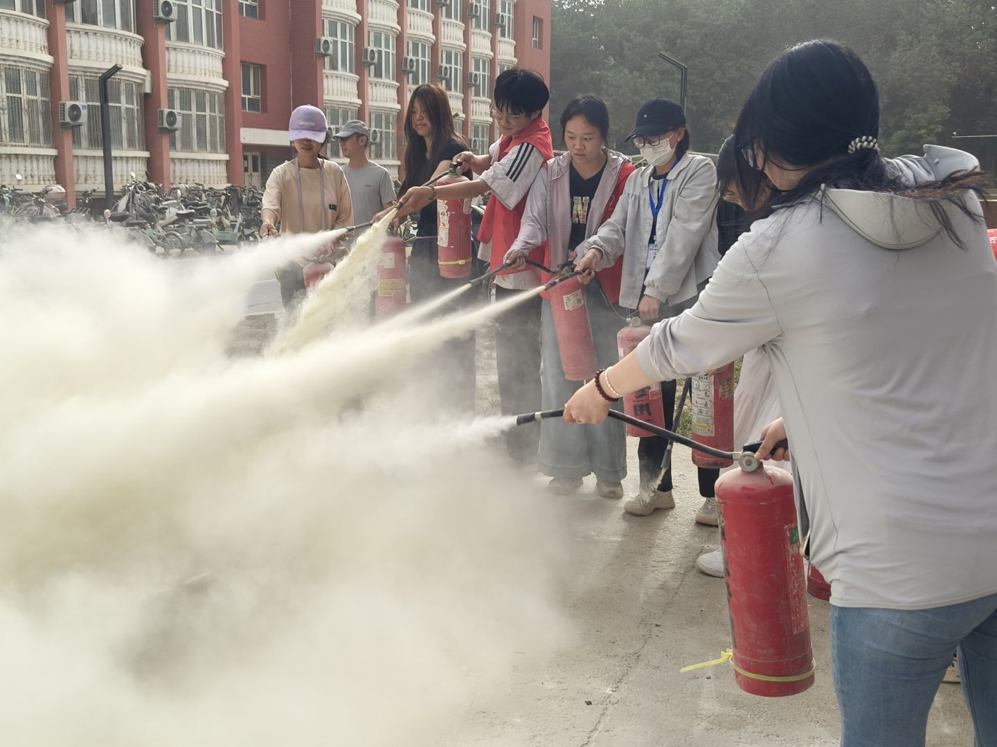 在东七宿舍与东十二宿舍联合举办消防演练活动。活动邀请学校保卫处的专业人员到场指导,为学生们普及安全知识并进行安全使用灭火器的示范。