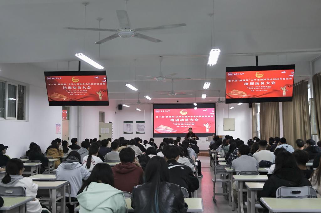 于逸夫楼306教室组织开展第十届“挑战杯”大学生课外学术科技作品竞赛培训动员大会。