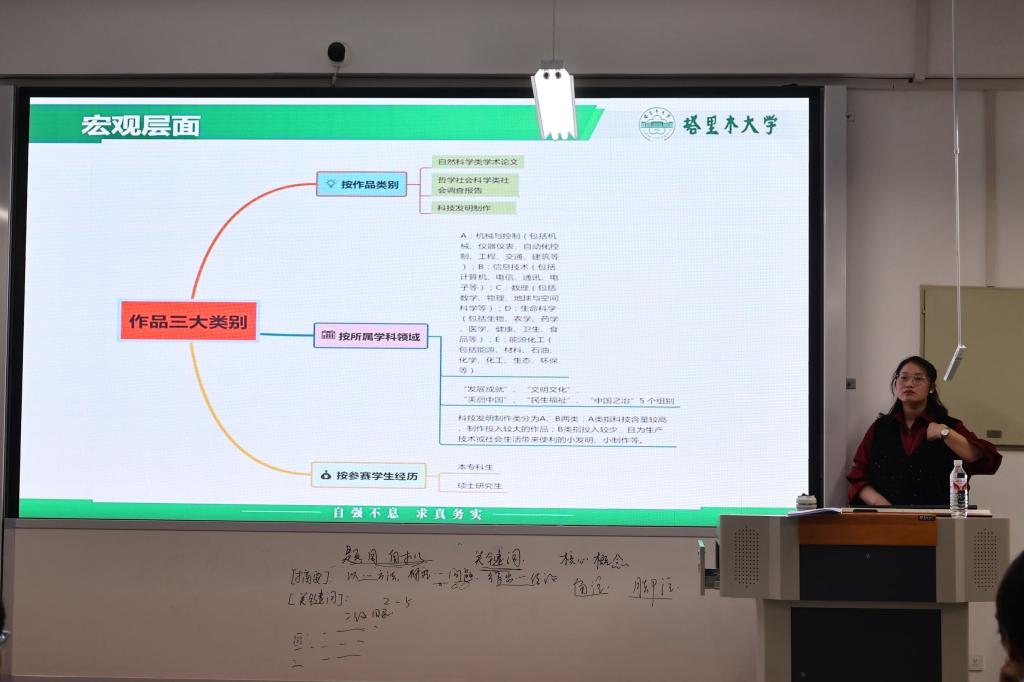 会议伊始,狄老师为大家讲解了“挑战杯”赛事的规则、流程及评审标准等问题,接下来围绕申报书撰写、PPT制作两个方面展开说明,特别提醒同学们要广泛阅读文献资料,注意申报书的格式;PPT制作要美观、清晰,不可进行繁琐的文字堆积。
