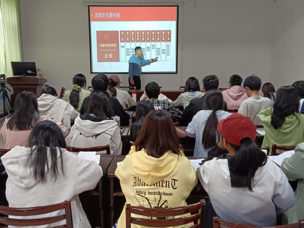 学院系主任孙长龙对团章进行专题讲解,带领大家更好的认识共青团,包括团的团的制度、中央组织、团旗、团徽、团歌、同少年先锋队关系等。指出中国共产主义青年团应当贯彻青年原则,发挥模范带头作用。