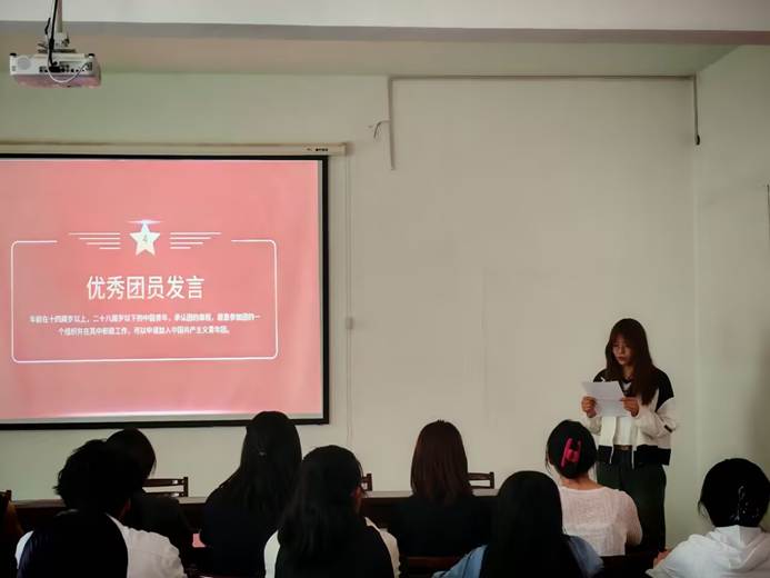 “我志愿加入中国共产主义青年团,坚决拥护中国共产党的领导……”在组织部干事尹宇豪的带领下,新团员面向团旗庄严宣誓。誓言坚定,彰显了新时代青年坚定不移听党话、跟党走的决心。新团员代表冯轲欣以“以青春之名,赴时代之约”为主题发言。她承诺将以更高标准要求自己,在学业、实践中践行团员责任,不负组织期望。