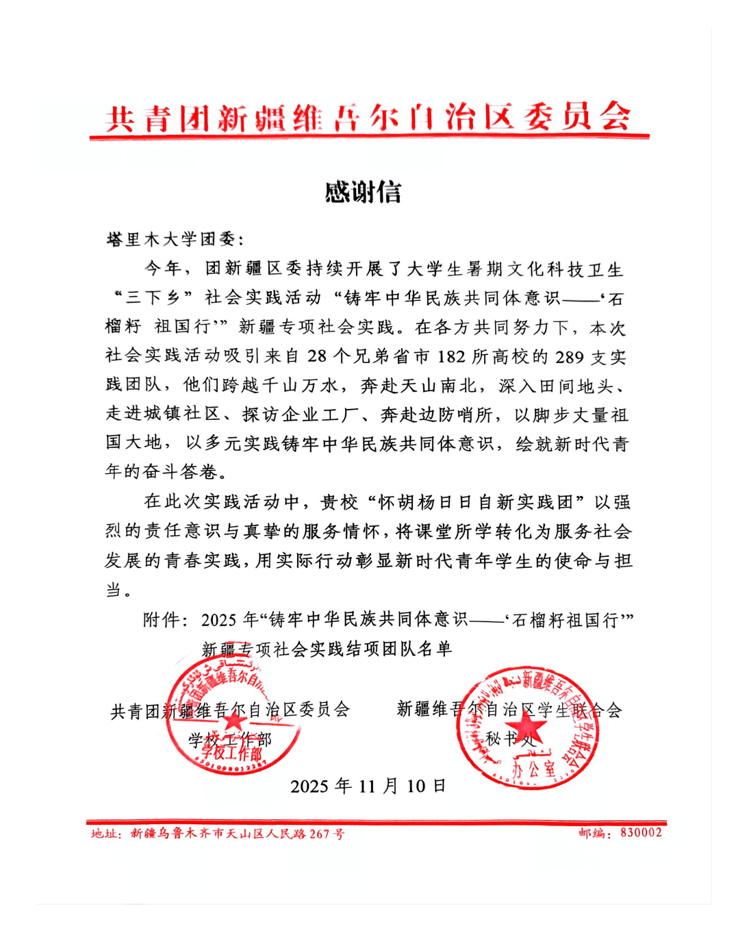 近日,我院“怀胡杨日日自新”实践团队收到共青团新疆维吾尔自治区委员会的来信表扬,对其在2025年暑期赴南疆多地开展的青少年历史文化研学体验活动予以充分肯定。该实践活动属于“铸牢中华民族共同体意识·石榴籽祖国行”新疆专项社会实践,由共青团新疆维吾尔自治区委员会与新疆维吾尔自治区学生联合会共同组织。本次专项共吸引来自全国28个省市182所高校的289支团队参与。各团队深入天山南北的基层一线,通过实地调研、社区服务、文化体验等多种形式,积极践行民族团结,深化中华民族共同体意识教育。